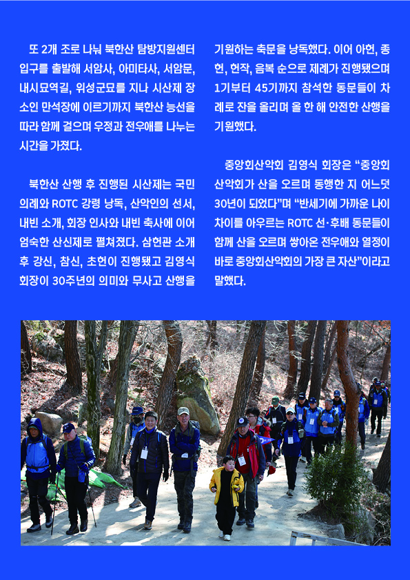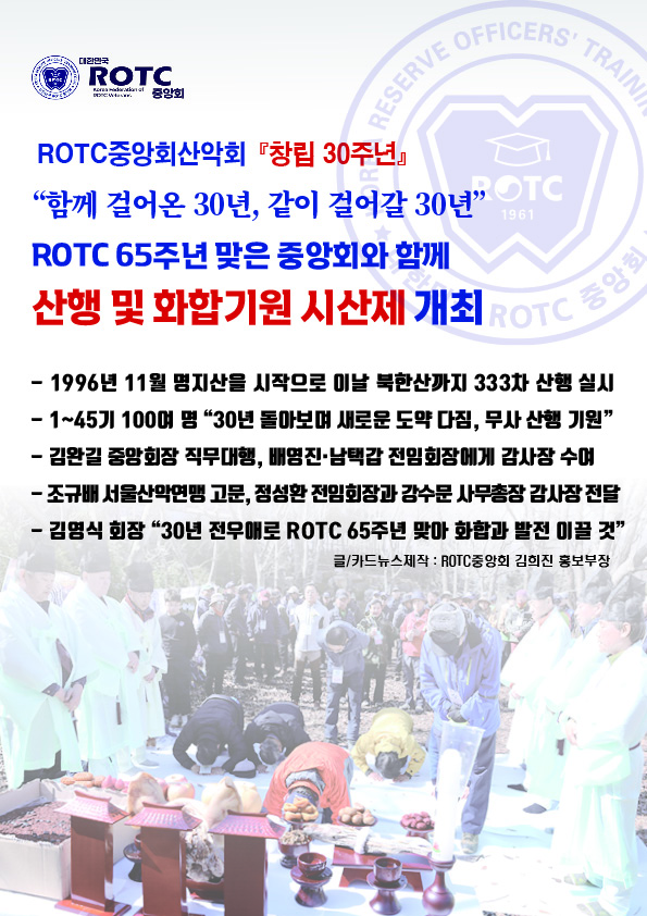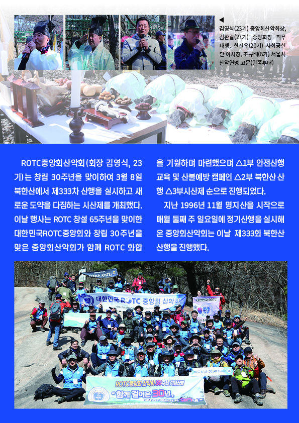 대한민국 ROTC 중앙회 산악회(회장 김영식)는 3월 산행으로 북한산에서 화합기원 시산제를 진행 했다.