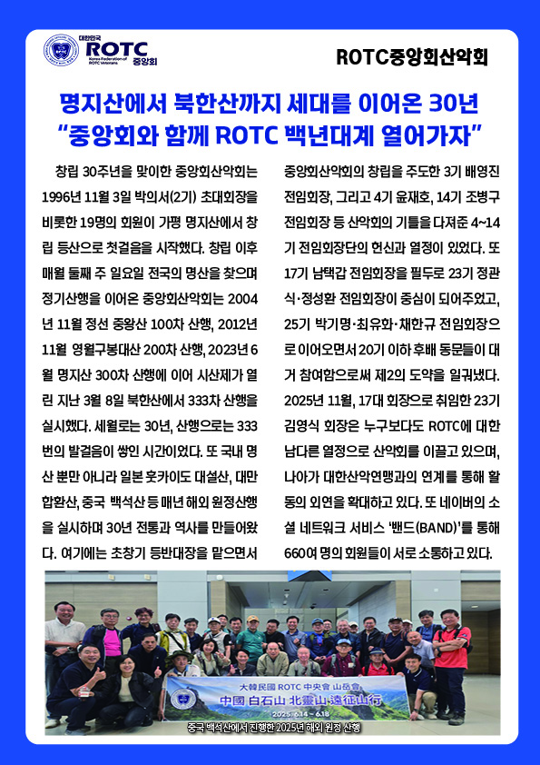 동문 및 가족 120 여명이 참여한 이번 산행은 ROTC중앙회와 서울시 산악연맹 임원들이 참석하여 2026년의 안전한 산행을 기원했다.