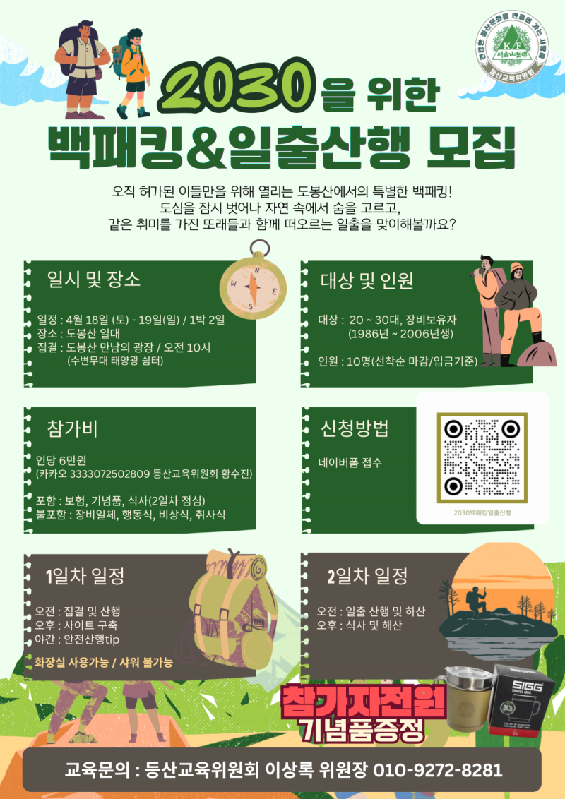 서울시 산악연맹 등산교육위원에서 진행하는 2030을 위한 백패킹 &일출산행에 많은참여 바랍니다.