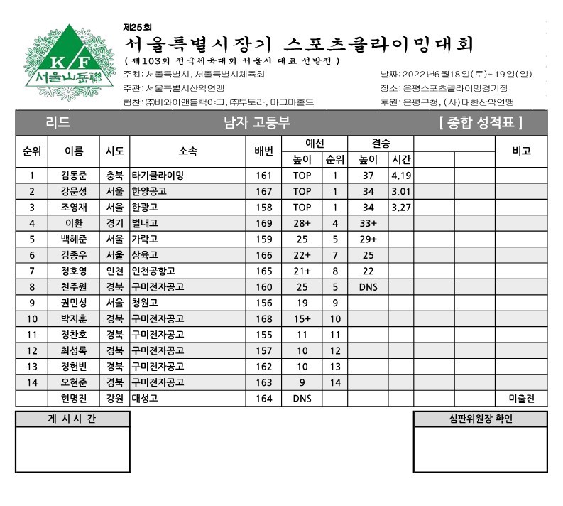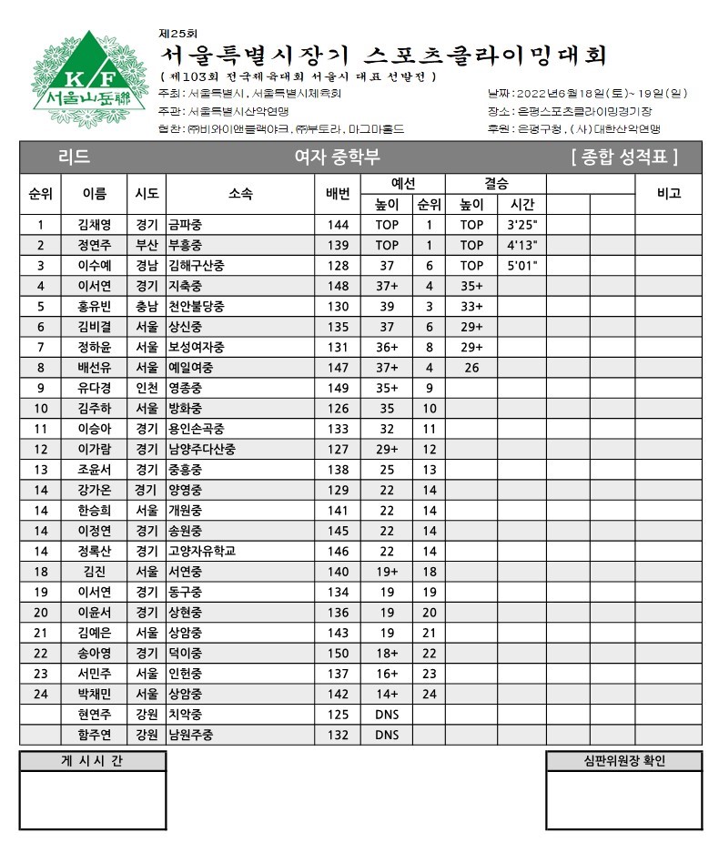 제25회 서울특별시장기 스포츠클라이밍대회 19일 성적 결과표 작성자 정보 관리자 작성 2,259 조회 작성일 2022.06.20 11:33 컨텐츠 정보 본문 제25회 서울특별시장기 스포츠클라이밍대회에 참가 해주신 선수 여러분 모두 수고 많으셨습니다. SNS 공유 관련자료 이전 2022 청송 썸머 전국드라이툴링대회 개최 안내 작성일 2022.07.01 다음 제25회 서울특별시장기 스포츠클라이밍대회 18일 성적결과표 작성일 2022.06.20 댓글 0개 등록된 댓글이 없습니다. 로그인한 회원만 댓글 등록이 가능합니다. 목록