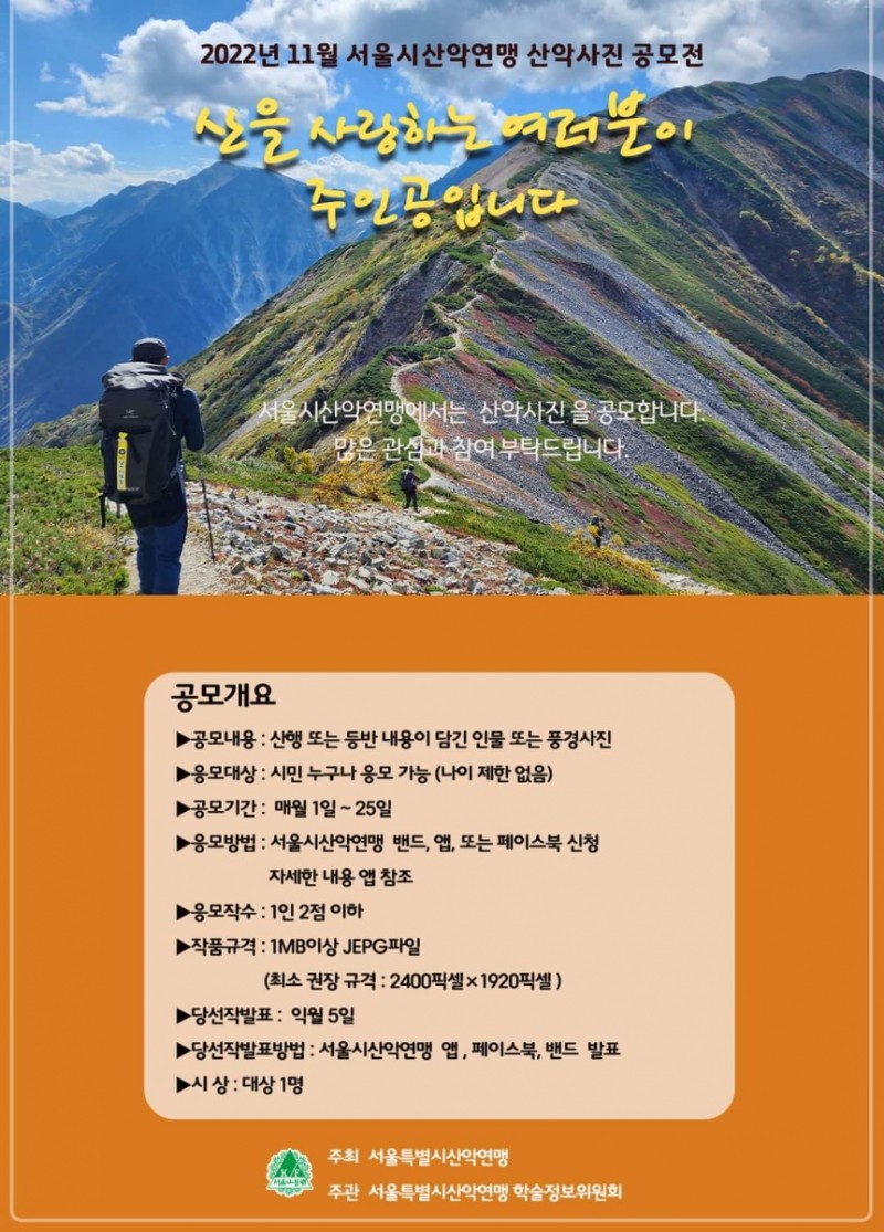 2022년 11월 서울시산악연맹 산악사진 공모전 작성자 정보 관리자 작성 1,510 조회 작성일 2022.11.11 09:16 컨텐츠 정보 본문 SNS 공유 관련자료 이전 서울시산악연맹 "산"사진 공모전 10월 당선작 작성일 2022.11.11 다음 도봉산 선인봉에 신규 루트 개척 - 안내 작성일 2022.11.10 댓글 0개 등록된 댓글이 없습니다. 로그인한 회원만 댓글 등록이 가능합니다. 목록
